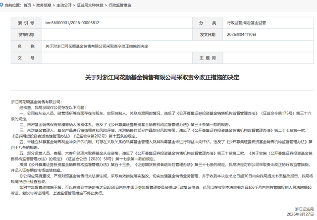 4月10日,浙江证监局披露的行政监管措施决定书显示,浙江同花顺基金销售有限公司(简称:同花顺基金)因存在多项合规问题,被监管责令改正并记入证券期货市场诚信档案。