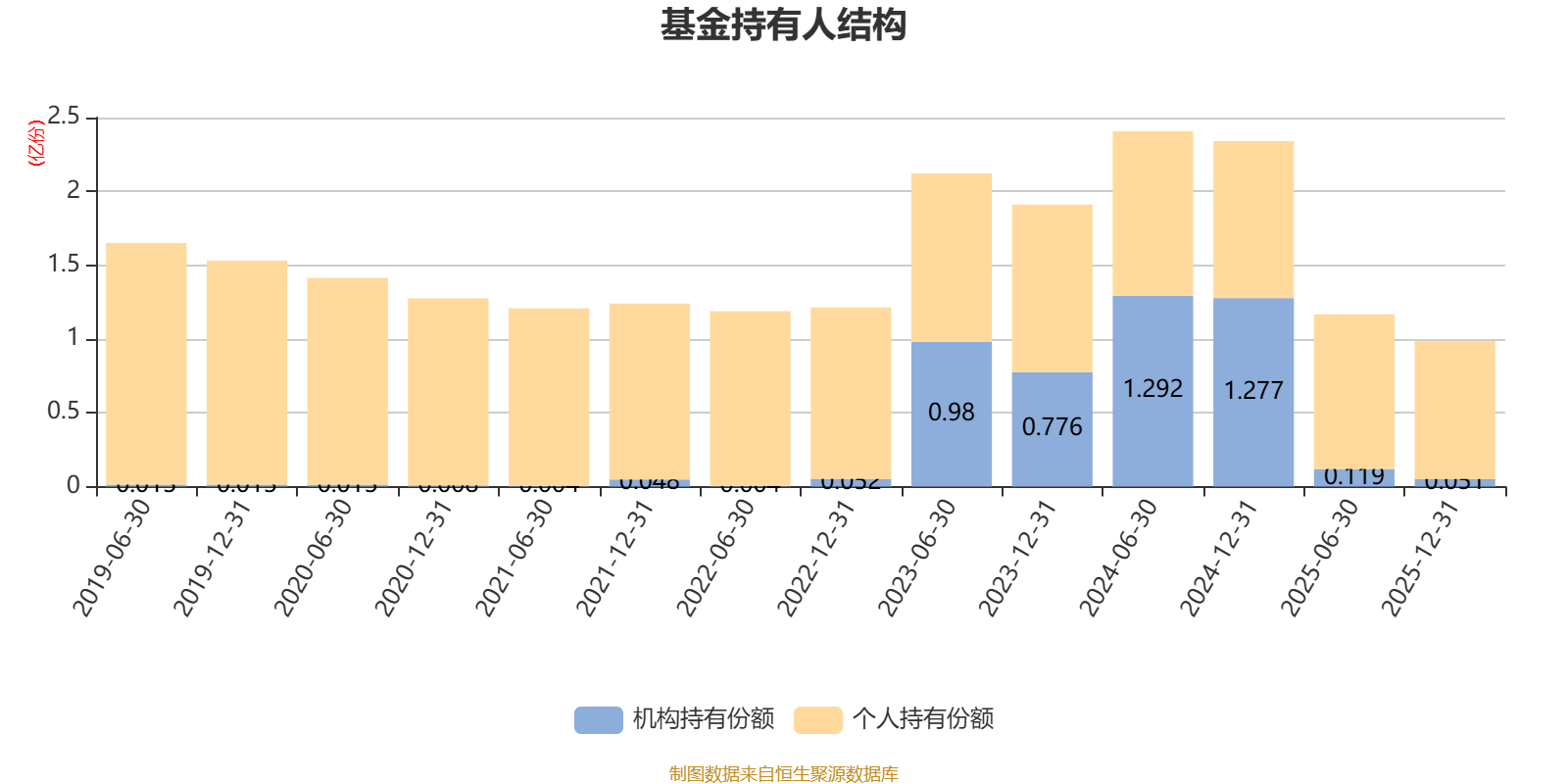 截至2025年12月31日,基金持有人共计7516户,合计持有9870.73万份。其中管理人员工持有59.91万份,占比0.61%,机构持有份额占比5.21%,个人投资者占比94.79%。
