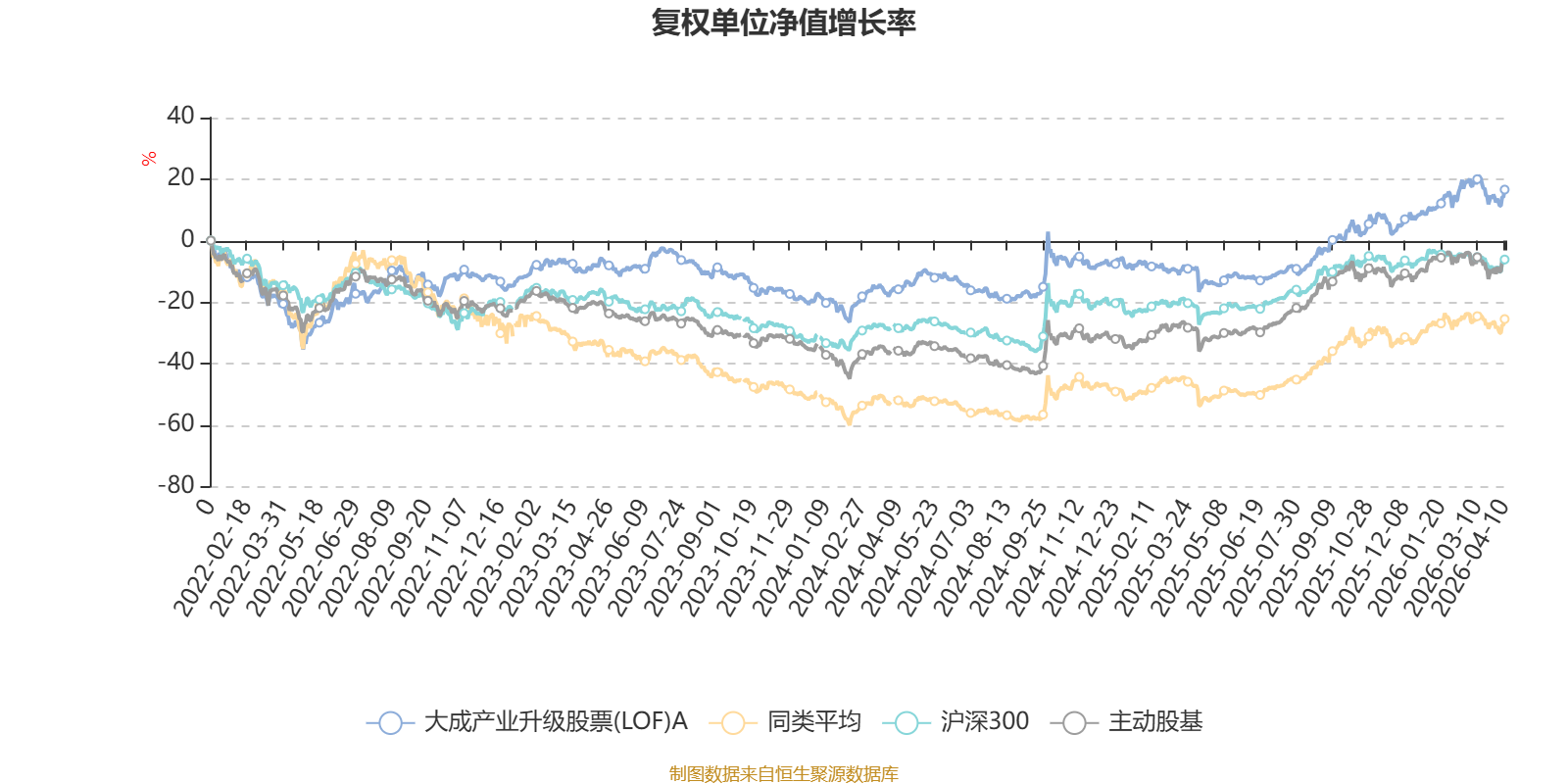 截至4月10日,大成产业升级股票(LOF)A近三个月复权单位净值增长率为5.26%,位于同类可比基金9/39;近半年复权单位净值增长率为11.03%,位于同类可比基金11/39;近一年复权单位净值增长率为35.37%,位于同类可比基金30/39;近三年复权单位净值增长率为26.41%,位于同类可比基金11/33。
