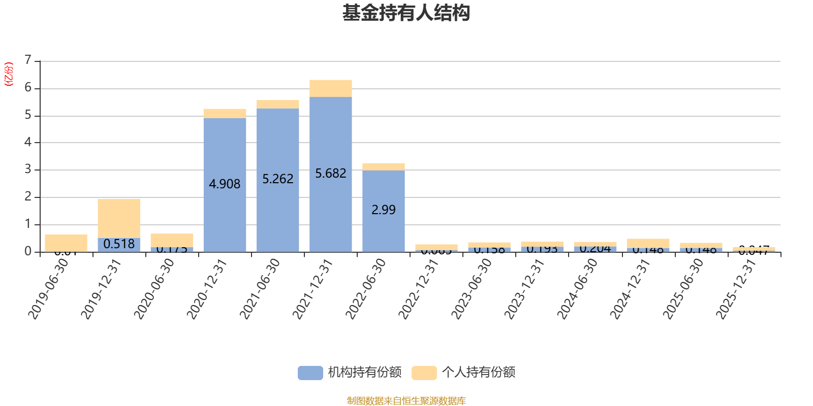 截至2025年12月31日,基金持有人共计607户,合计持有1770.82万份。其中管理人员工持有3.57万份,占比0.20%,机构持有份额占比26.75%,个人投资者占比73.25%。