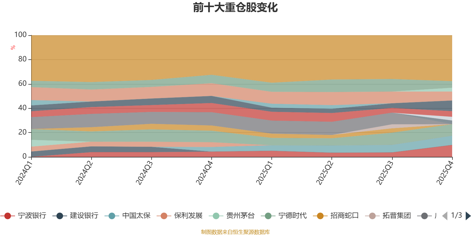 该基金持股集中度较高,近2年前十大重仓股集中度长期超过60%。截至2025年末,基金十大重仓股分别是宁波银行、宁德时代、中国平安、中国太保、江苏银行、杭州银行、沪农商行、广发证券、新华保险、三花智控。