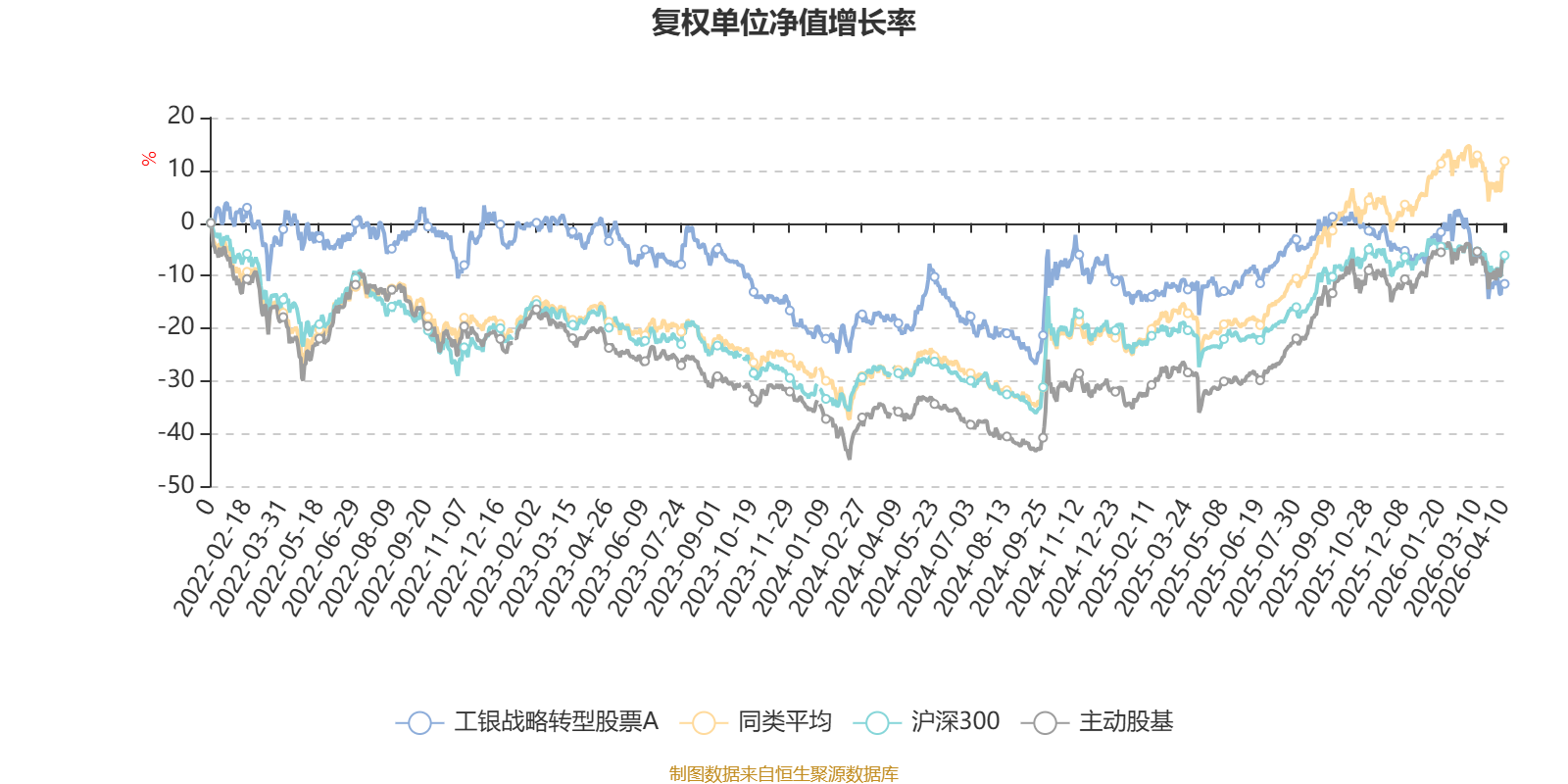 截至4月10日,工银战略转型股票A近三个月复权单位净值增长率为-9.20%,位于同类可比基金56/58;近半年复权单位净值增长率为-12.45%,位于同类可比基金58/58;近一年复权单位净值增长率为0.23%,位于同类可比基金56/57;近三年复权单位净值增长率为-10.92%,位于同类可比基金55/57。