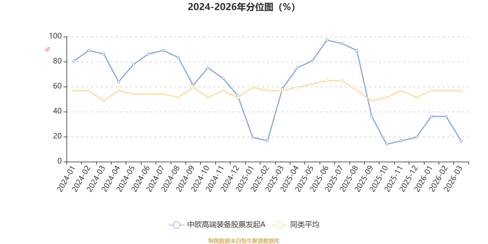 通过所选区间该基金净值增长率分位图,可以观察该基金与同类基金业绩比较情况。图为坐标原点到区间内某时点的净值增长率在同类基金中的分位数。