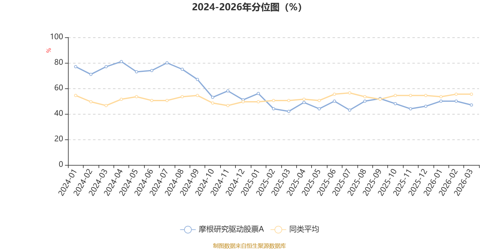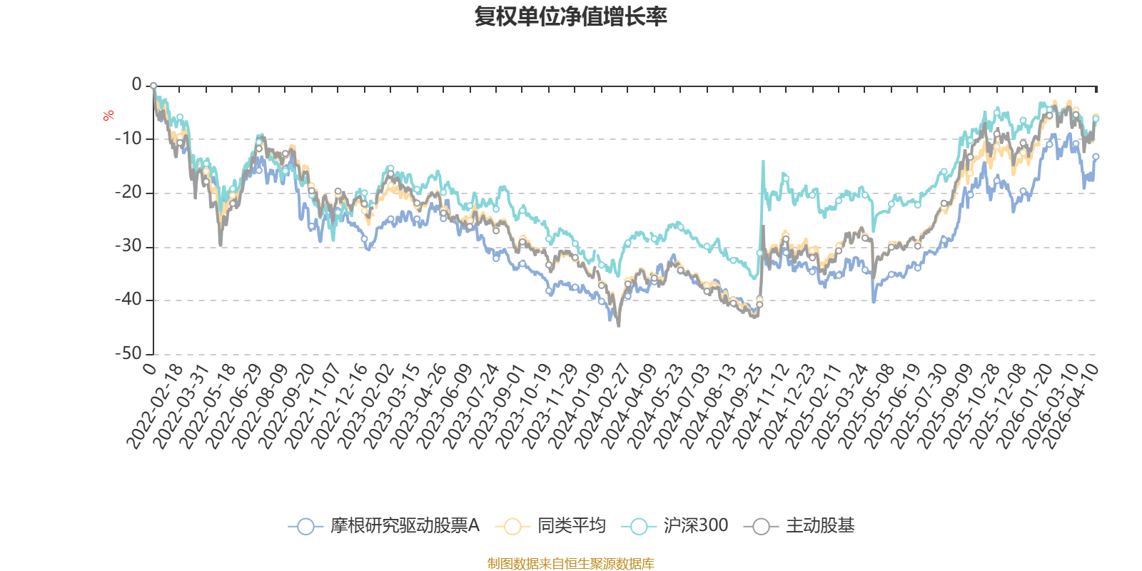 截至4月10日,摩根研究驱动股票A近三个月复权单位净值增长率为-0.63%,位于同类可比基金75/121;近半年复权单位净值增长率为4.38%,位于同类可比基金76/121;近一年复权单位净值增长率为40.12%,位于同类可比基金54/120;近三年复权单位净值增长率为12.85%,位于同类可比基金54/90。