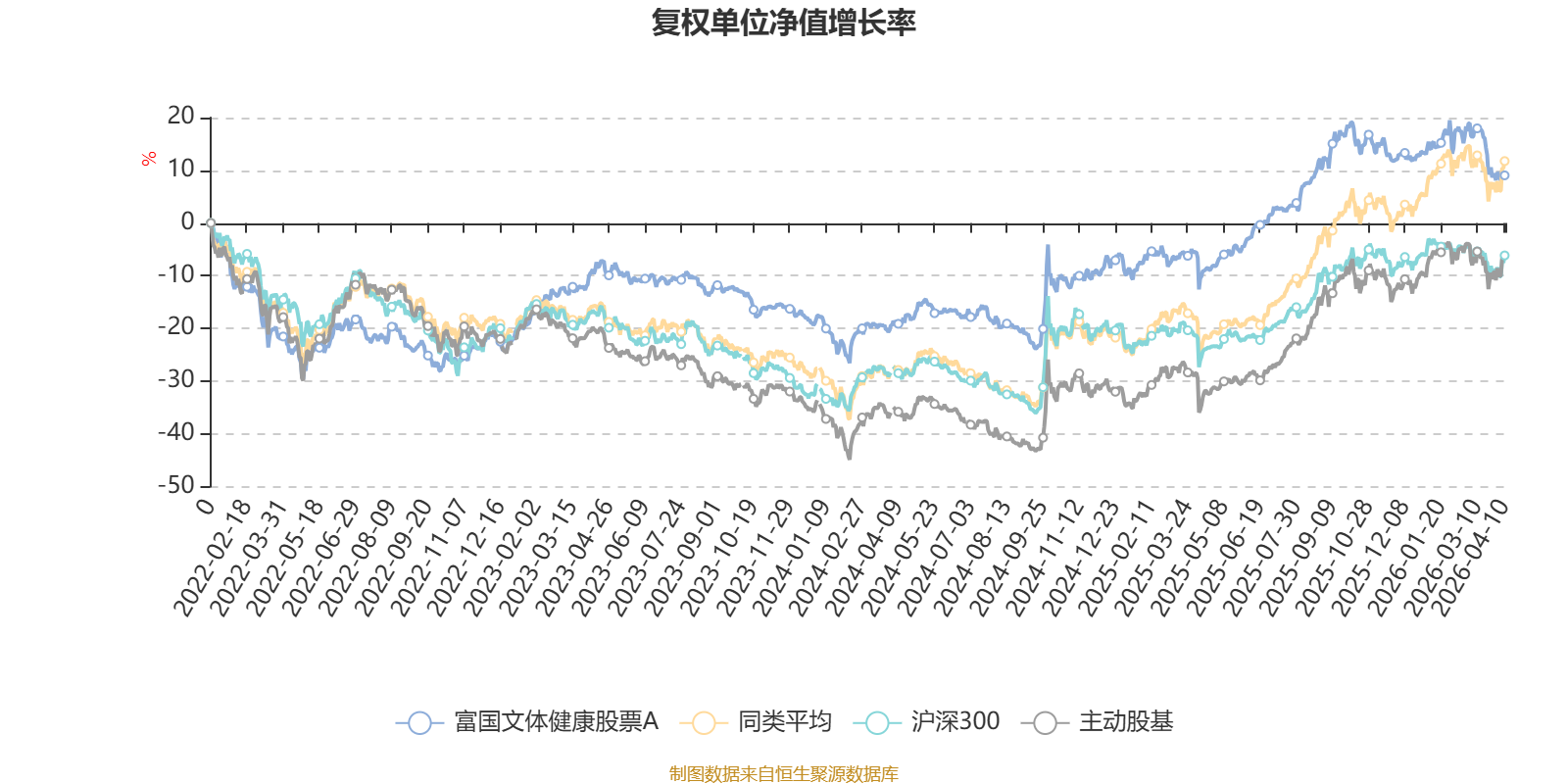 截至4月10日,富国文体健康股票A近三个月复权单位净值增长率为-5.32%,位于同类可比基金54/58;近半年复权单位净值增长率为-7.59%,位于同类可比基金54/58;近一年复权单位净值增长率为20.03%,位于同类可比基金45/57;近三年复权单位净值增长率为20.64%,位于同类可比基金38/57。