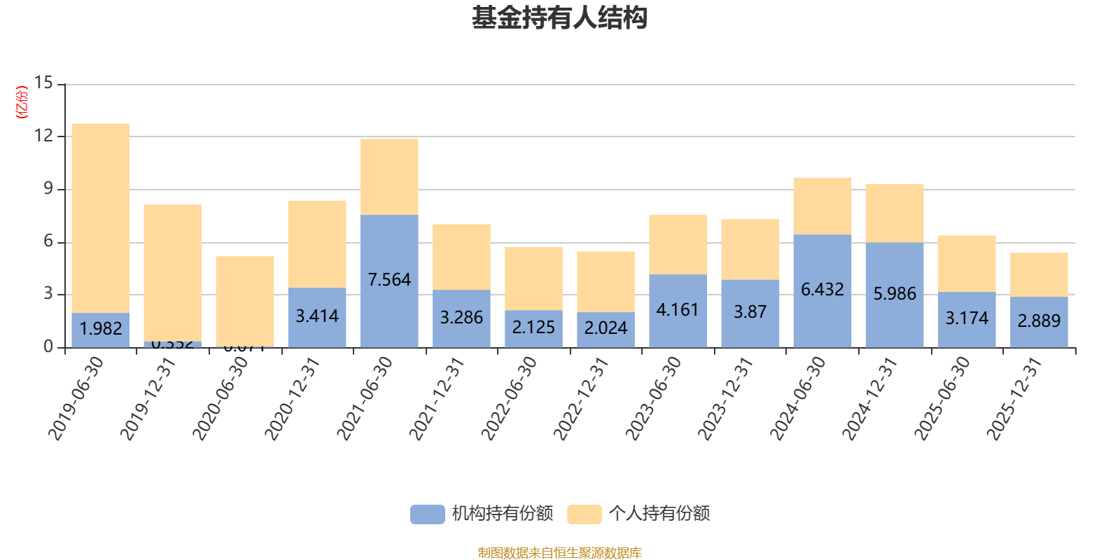 截至2025年12月31日,基金持有人共计4.69万户,合计持有5.4亿份。其中管理人员工持有116.88万份,占比0.22%,机构持有份额占比53.48%,个人投资者占比46.52%。