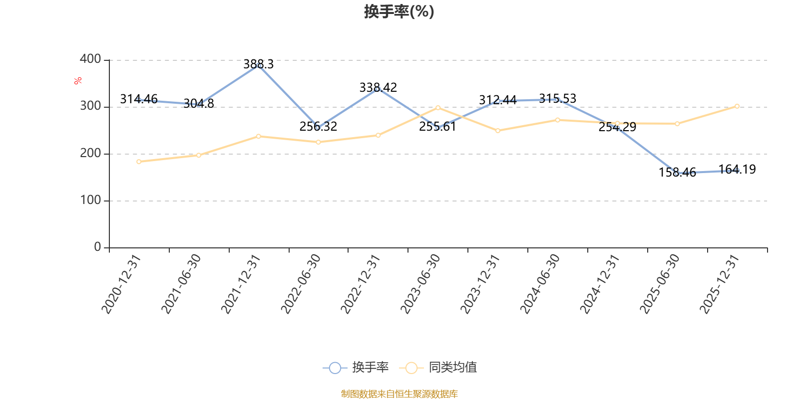 截至2025年12月31日,基金最近一年换手率约319.11%,持续1年低于同类均值。