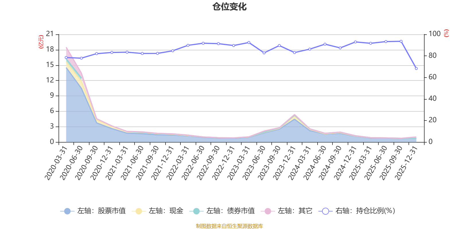据定期报告数据统计,近三年平均股票仓位为87.7%,同类平均为88.34%。2025年三季度末基金达到93.55%的最高仓位,2025年末最低,为68.31%。