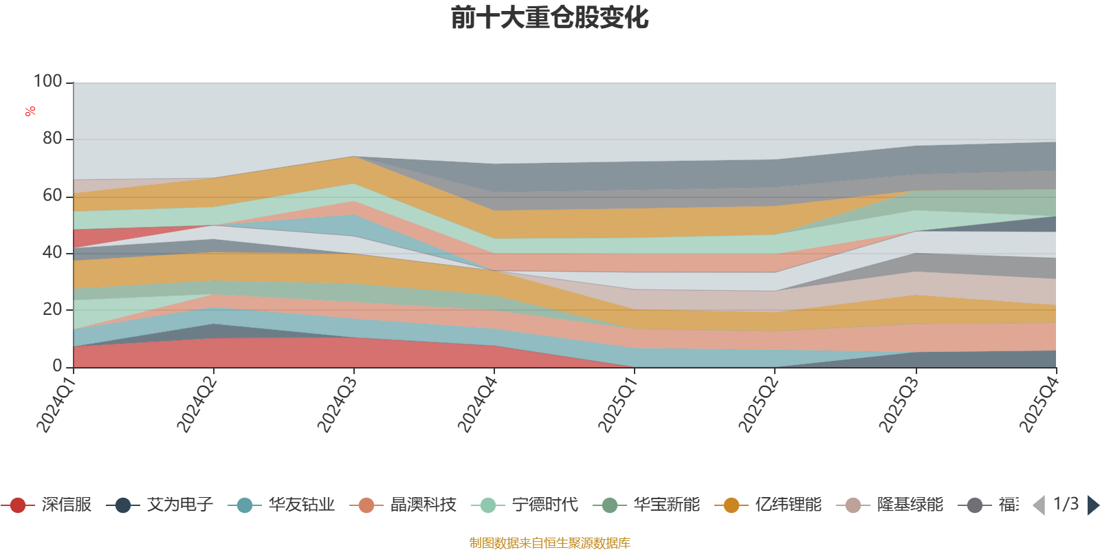 该基金持股集中度较高,近2年前十大重仓股集中度长期超过60%。截至2025年末,基金十大重仓股分别是通威股份、晶澳科技、天合光能、固德威、隆基绿能、福莱特、东方日升、亿纬锂能、艾为电子、TCL中环。