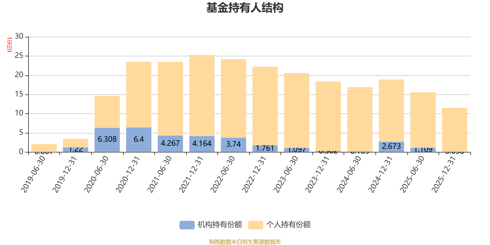 截至2025年12月31日,基金持有人共计14.99万户,合计持有11.51亿份。其中管理人员工持有35.69万份,占比0.03%,机构持有份额占比0.50%,个人投资者占比99.50%。