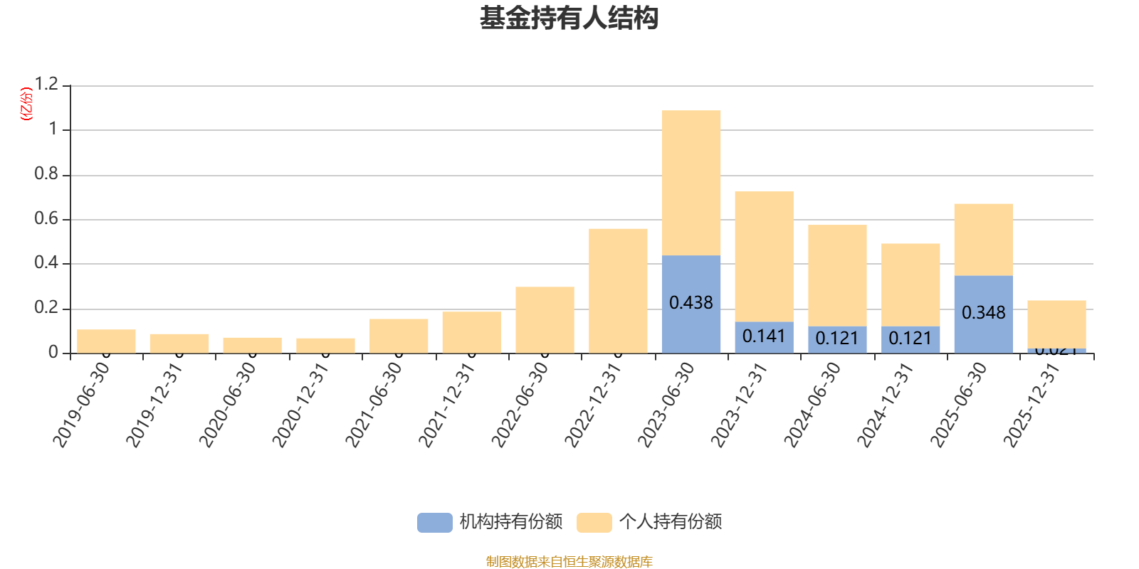 截至2025年12月31日,基金持有人共计2.15万户,合计持有2362.44万份。其中管理人员工持有6.52万份,占比0.28%,机构持有份额占比9.09%,个人投资者占比90.91%。