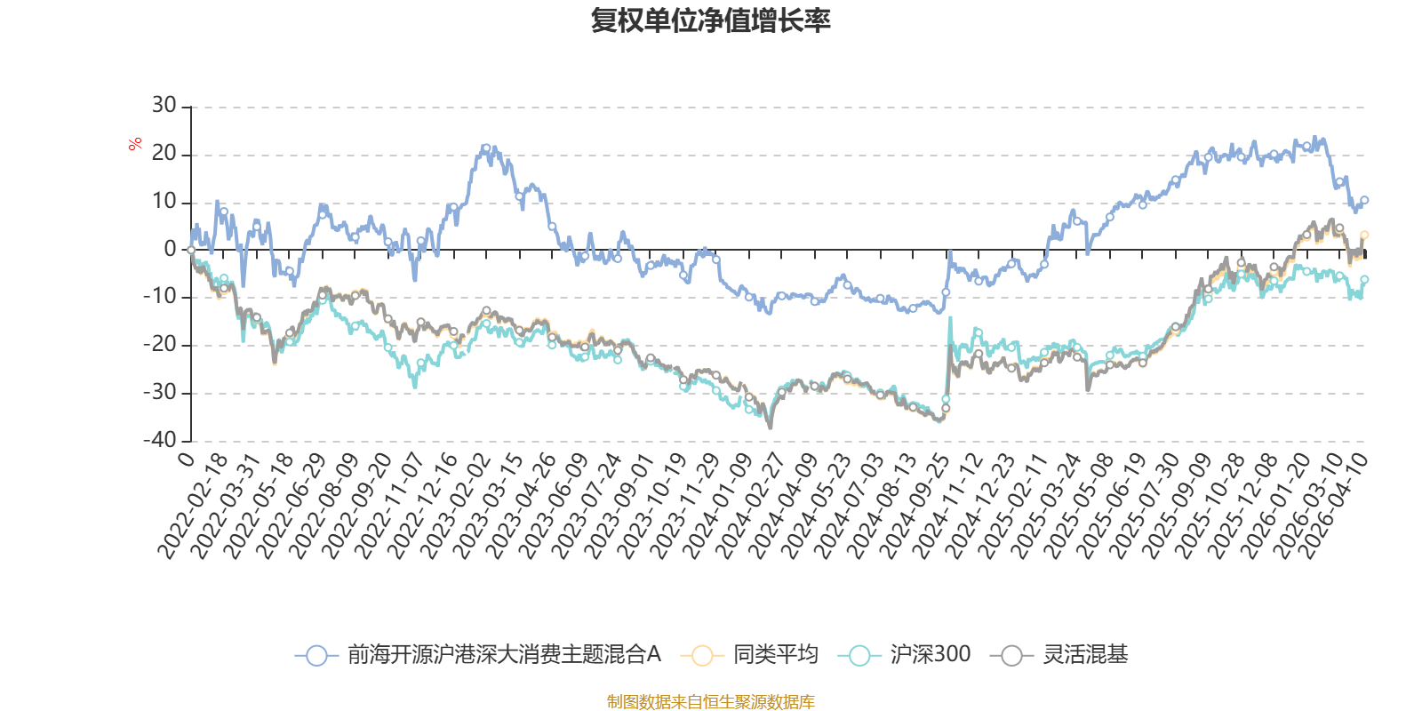 截至4月10日,前海开源沪港深大消费主题混合A近三个月复权单位净值增长率为-9.38%,位于同类可比基金1186/1287;近半年复权单位净值增长率为-7.71%,位于同类可比基金1181/1286;近一年复权单位净值增长率为8.89%,位于同类可比基金1054/1286;近三年复权单位净值增长率为-1.78%,位于同类可比基金1025/1286。