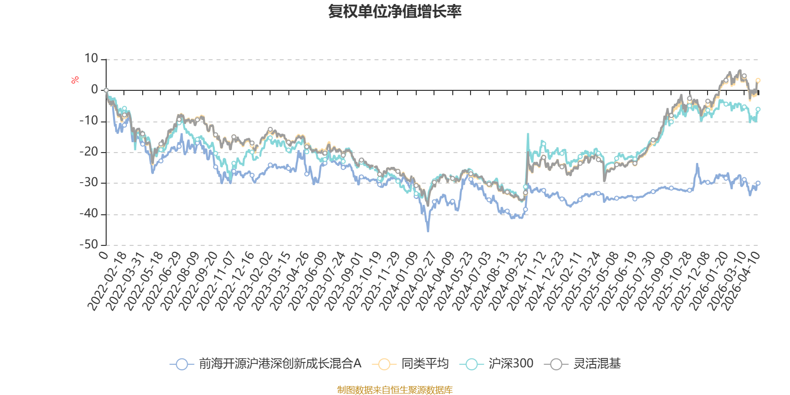 截至4月10日,前海开源沪港深创新成长混合A近三个月复权单位净值增长率为-3.40%,位于同类可比基金959/1287;近半年复权单位净值增长率为3.29%,位于同类可比基金680/1286;近一年复权单位净值增长率为7.89%,位于同类可比基金1075/1286;近三年复权单位净值增长率为-10.65%,位于同类可比基金1123/1286。