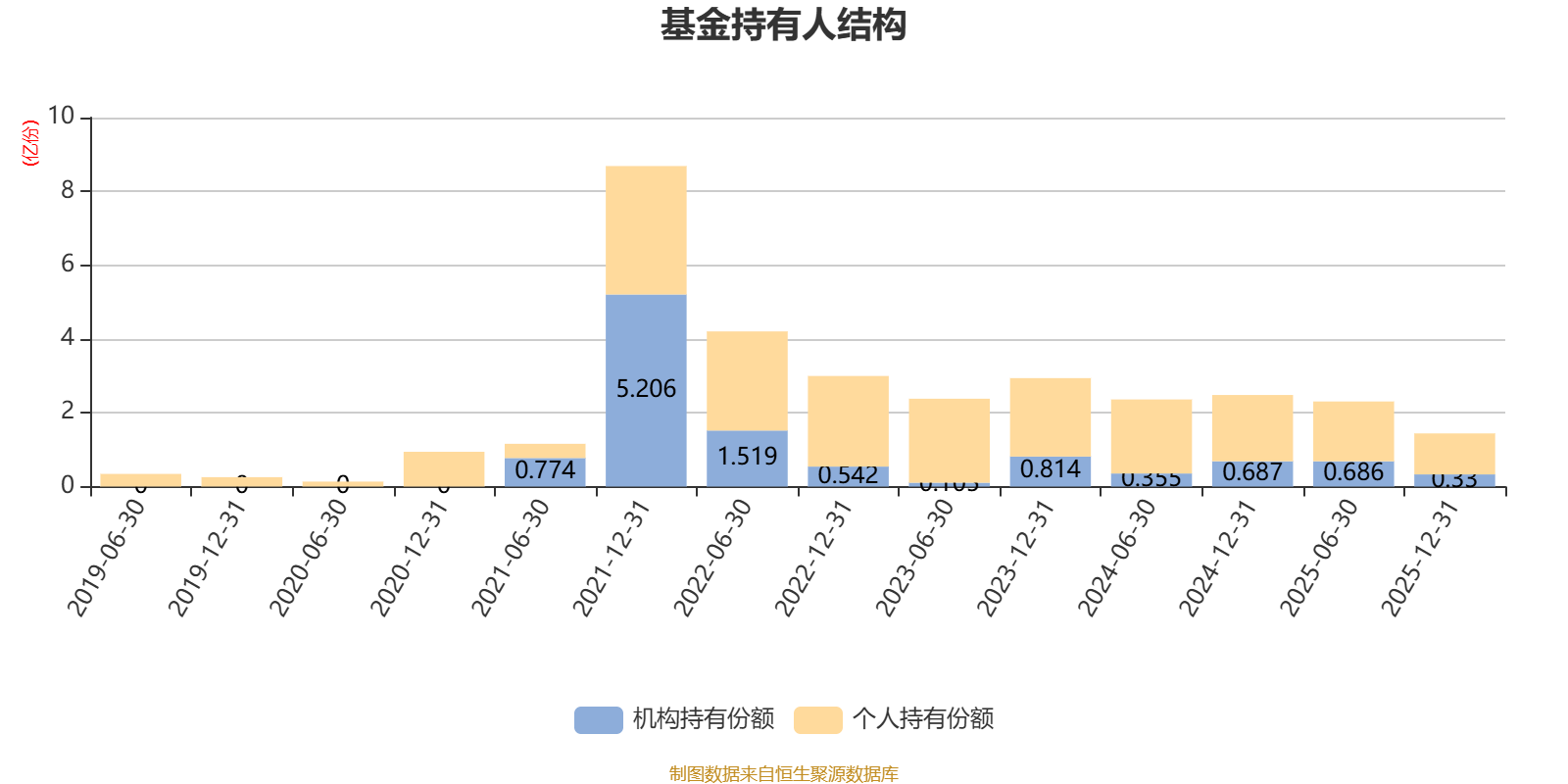 截至2025年12月31日,基金持有人共计1.11万户,合计持有1.44亿份。其中管理人员工持有4.87万份,占比0.03%,机构持有份额占比22.91%,个人投资者占比77.09%。
