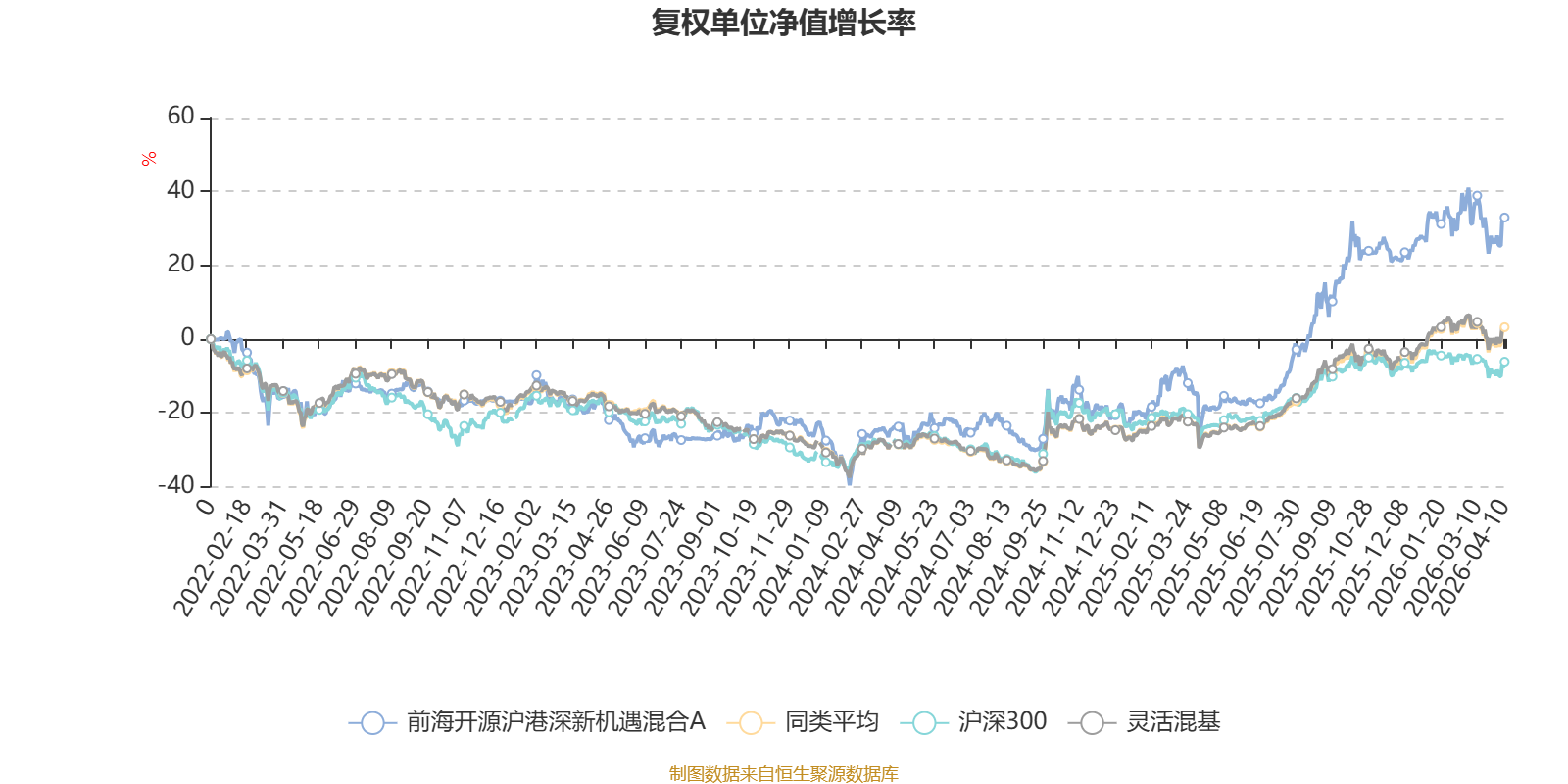 截至4月10日,前海开源沪港深新机遇混合A近三个月复权单位净值增长率为-0.27%,位于同类可比基金692/1287;近半年复权单位净值增长率为5.04%,位于同类可比基金568/1286;近一年复权单位净值增长率为68.15%,位于同类可比基金191/1286;近三年复权单位净值增长率为63.94%,位于同类可比基金101/1286。