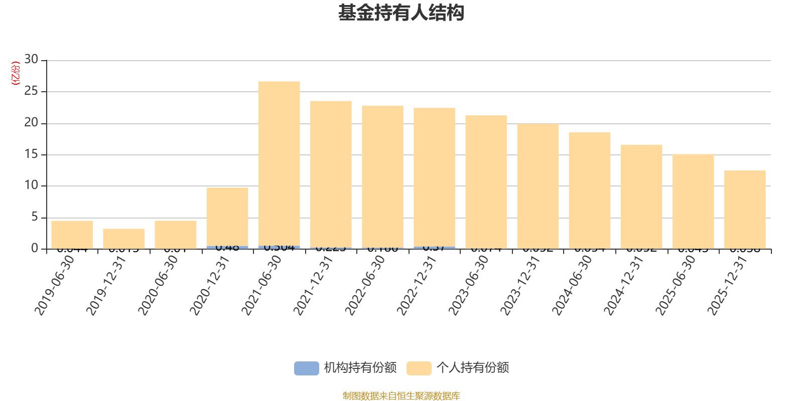 截至2025年12月31日,基金持有人共计29.53万户,合计持有12.46亿份。其中管理人员工持有192.62万份,占比0.15%,机构持有份额占比0.30%,个人投资者占比99.70%。