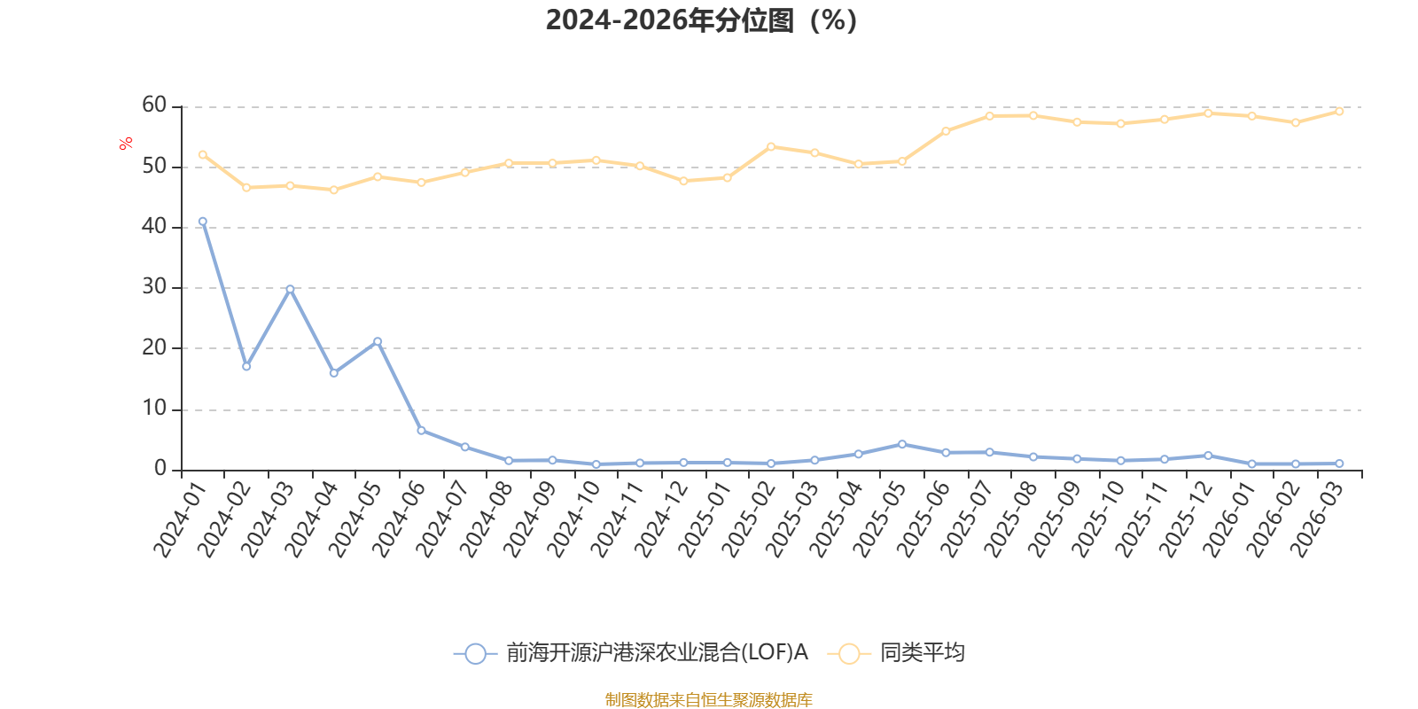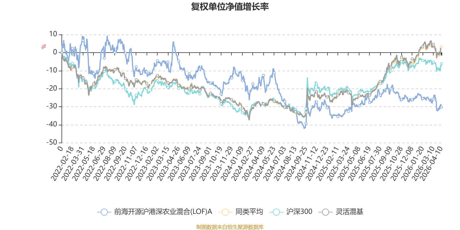 截至4月10日,前海开源沪港深农业混合(LOF)A近三个月复权单位净值增长率为-8.86%,位于同类可比基金1176/1287;近半年复权单位净值增长率为-10.72%,位于同类可比基金1229/1286;近一年复权单位净值增长率为-3.79%,位于同类可比基金1262/1286;近三年复权单位净值增长率为-32.49%,位于同类可比基金1270/1286。