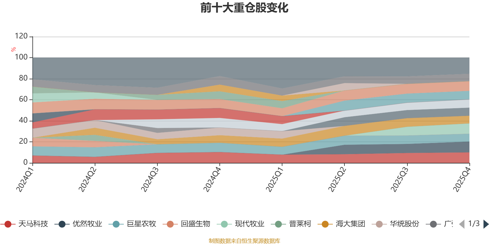 该基金持股集中度较高,近2年前十大重仓股集中度长期超过60%。截至2025年末,基金十大重仓股分别是优然牧业、天马科技、现代牧业、牧原股份、德康农牧、京基智农、中宠股份、巨星农牧、海大集团、立华股份。