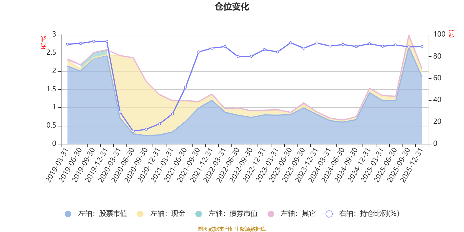 据定期报告数据统计,近三年平均股票仓位为89.79%,同类平均为72.57%。2019年末基金达到94.07%的最高仓位,2020年上半年末最低,为11.75%。
