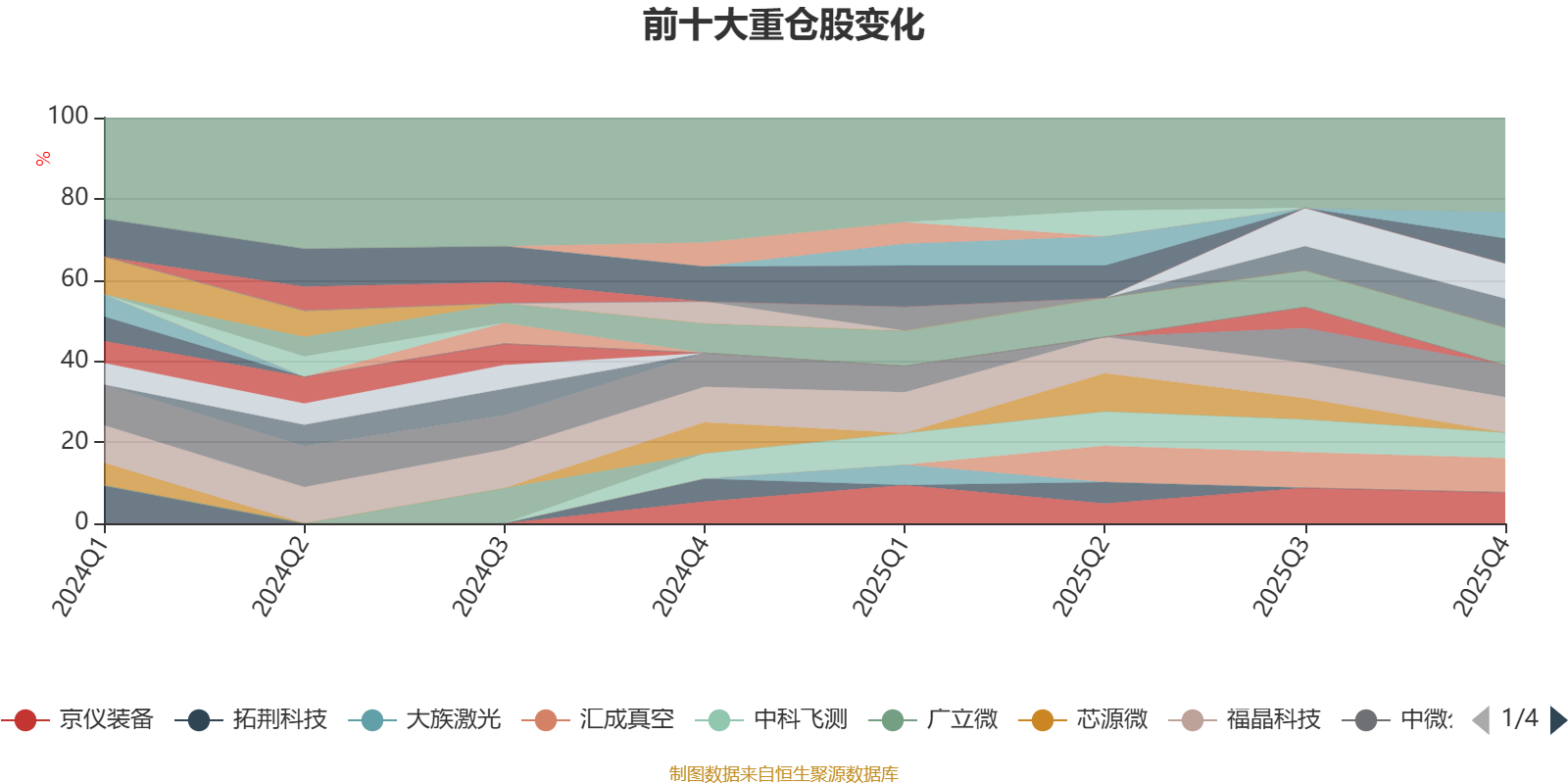 该基金持股集中度较高,近2年前十大重仓股集中度长期超过60%。截至2025年末,基金十大重仓股分别是茂莱光学、福晶科技、波长光电、汇成真空、中微公司、京仪装备、伟测科技、福光股份、中科飞测、北方华创。