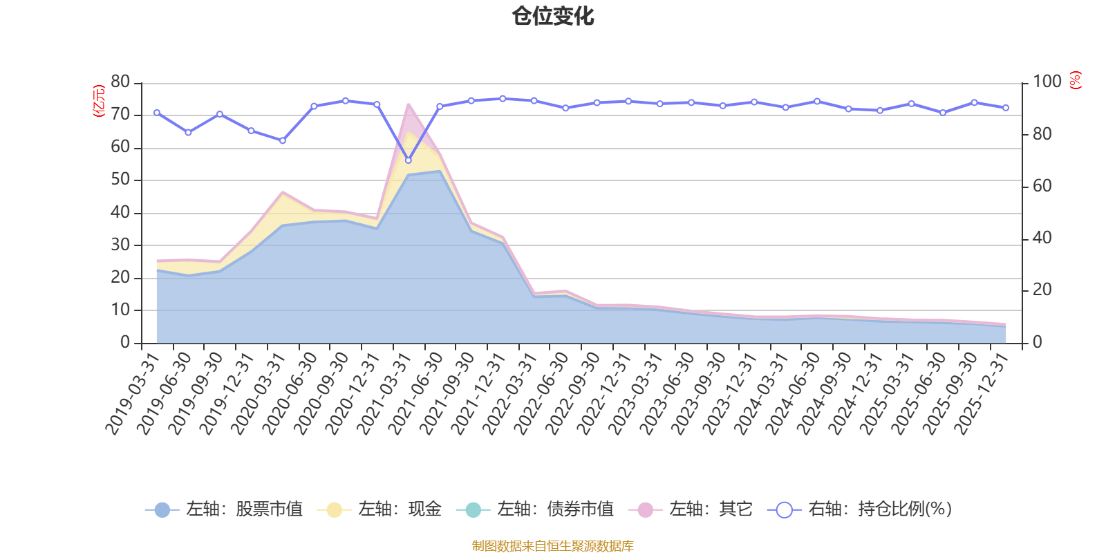 据定期报告数据统计,近三年平均股票仓位为91.25%,同类平均为72.57%。2021年末基金达到93.99%的最高仓位,2021年一季度末最低,为70.26%。
