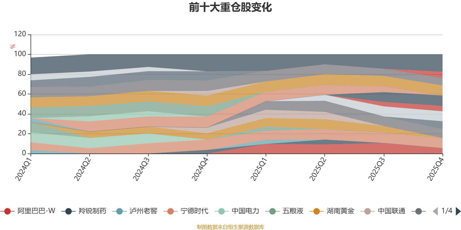 该基金持股集中度较高,近2年前十大重仓股集中度长期超过60%。截至2025年末,基金十大重仓股分别是中金黄金、宁德时代、腾讯控股、康方生物、小米集团-W、中国平安、贵州茅台、紫金矿业、西部水泥、阿里巴巴-W。