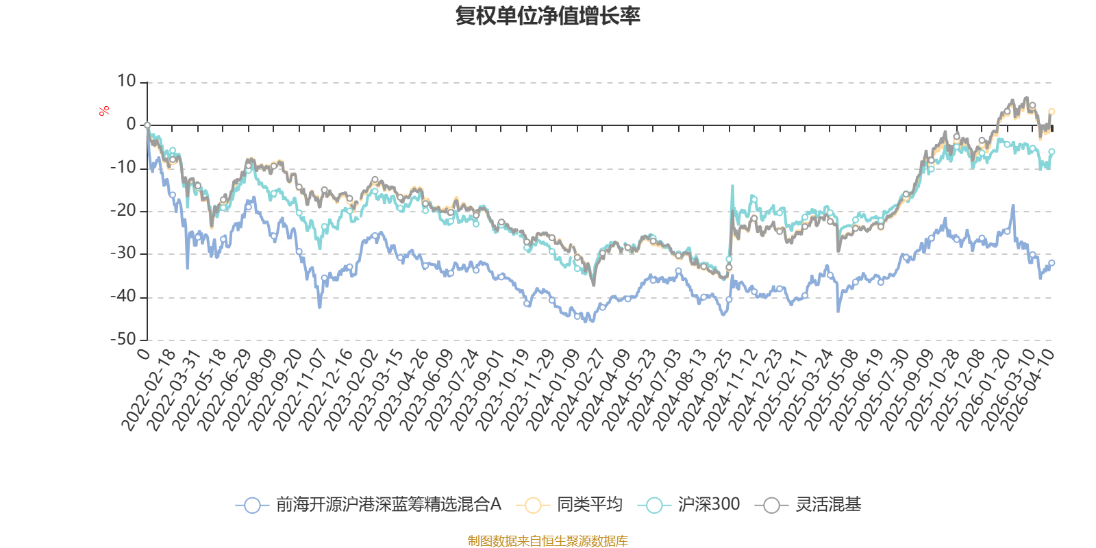截至4月10日,前海开源沪港深蓝筹精选混合A近三个月复权单位净值增长率为-8.86%,位于同类可比基金1174/1287;近半年复权单位净值增长率为-10.72%,位于同类可比基金1231/1286;近一年复权单位净值增长率为14.02%,位于同类可比基金966/1286;近三年复权单位净值增长率为-1.81%,位于同类可比基金1027/1286。
