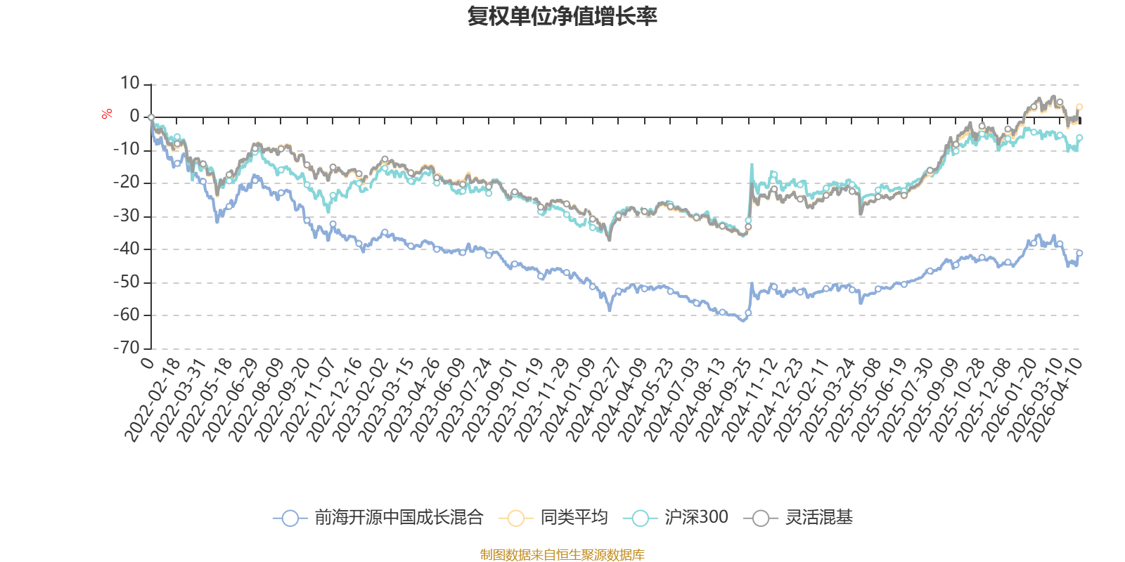 截至4月10日,前海开源中国成长混合近三个月复权单位净值增长率为-4.29%,位于同类可比基金1022/1287;近半年复权单位净值增长率为1.64%,位于同类可比基金830/1286;近一年复权单位净值增长率为29.99%,位于同类可比基金642/1286;近三年复权单位净值增长率为-5.49%,位于同类可比基金1071/1286。