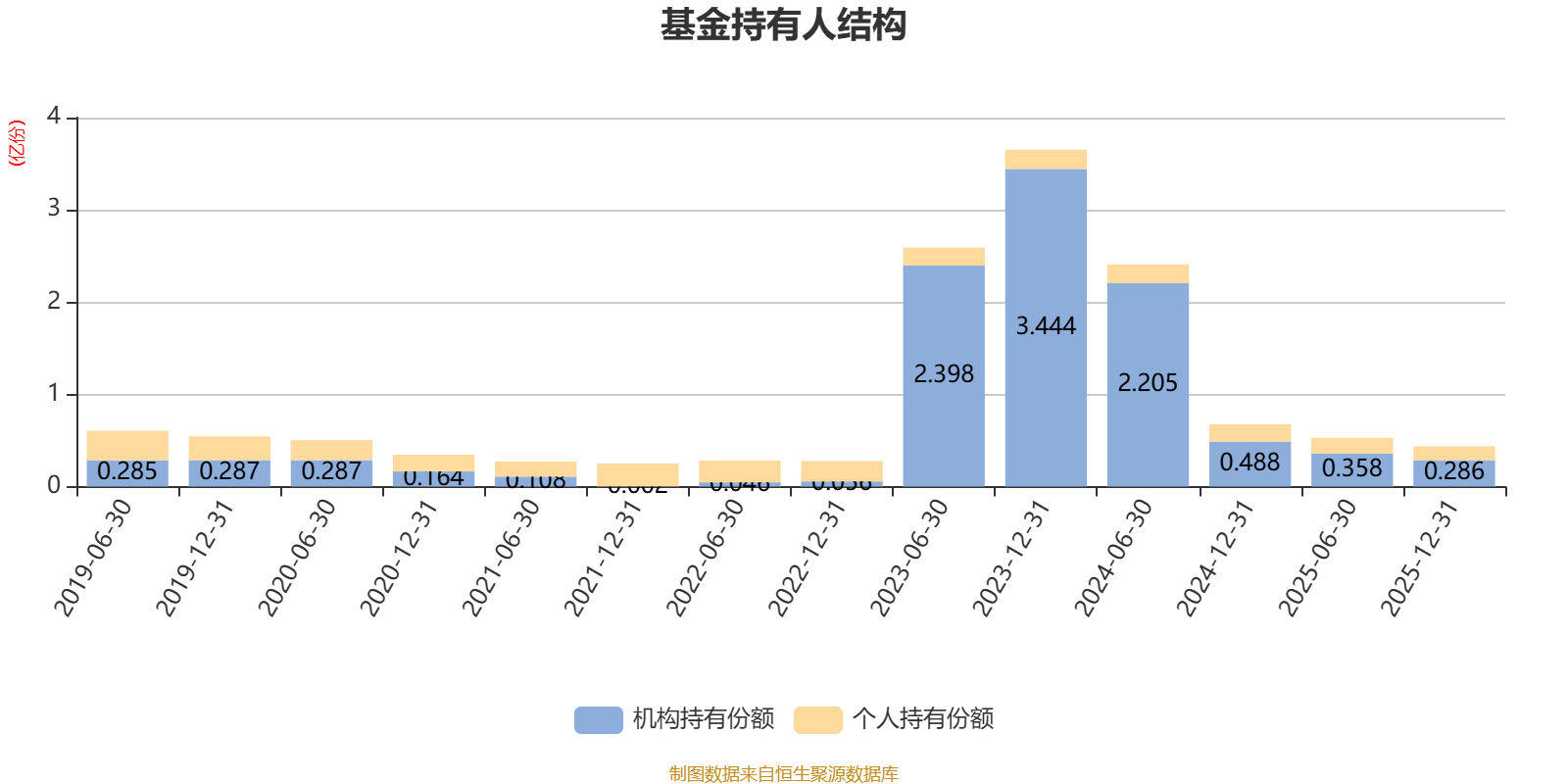 截至2025年12月31日,基金持有人共计1440户,合计持有4356.52万份。其中管理人员工持有4.58万份,占比0.11%,机构持有份额占比65.66%,个人投资者占比34.34%。