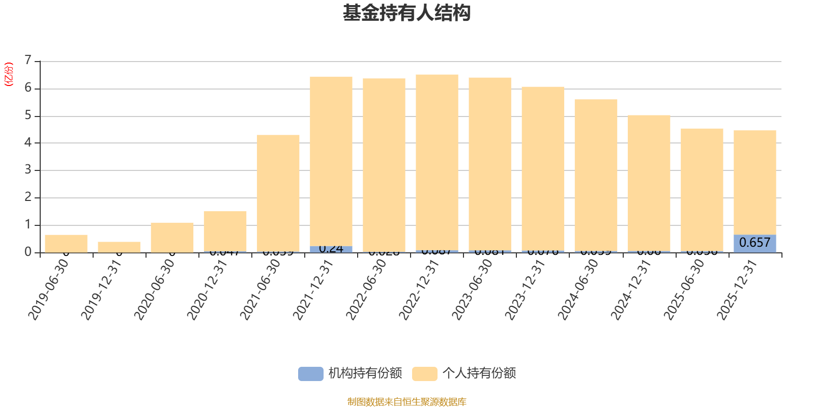 截至2025年12月31日,基金持有人共计6.1万户,合计持有4.47亿份。其中管理人员工持有159.93万份,占比0.36%,机构持有份额占比14.71%,个人投资者占比85.29%。