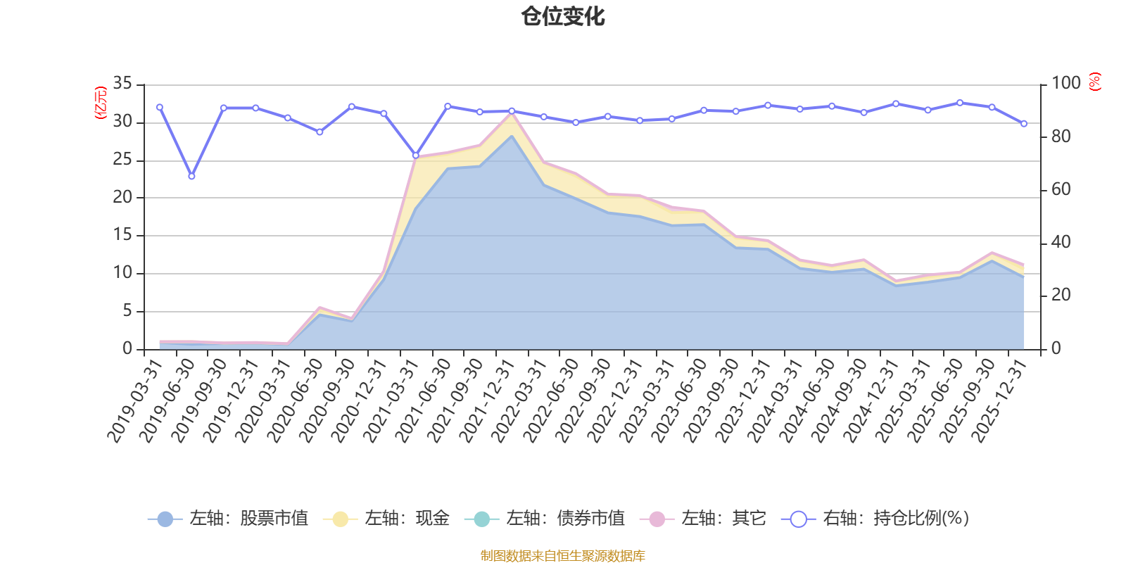 据定期报告数据统计,近三年平均股票仓位为90.34%,同类平均为72.57%。2025年上半年末基金达到93.11%的最高仓位,2019年上半年末最低,为65.37%。