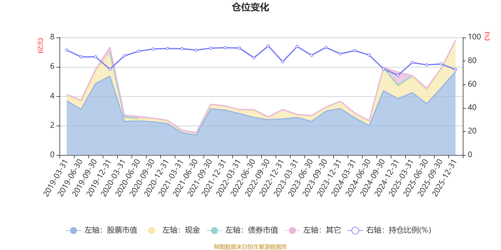 据定期报告数据统计,近三年平均股票仓位为81.32%,同类平均为72.57%。2022年三季度末基金达到92.8%的最高仓位,2024年末最低,为67.89%。