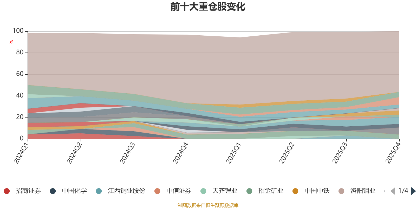 截至2025年末,基金十大重仓股分别是中国铝业、中矿资源、云铝股份、紫金矿业、招金矿业、铜陵有色、赣锋锂业、山东黄金、同力天启、中金黄金。