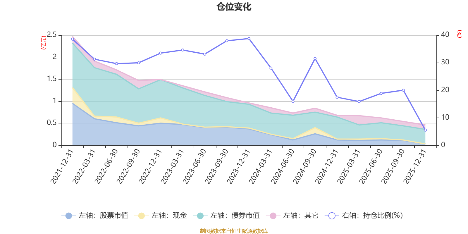 据定期报告数据统计,近三年平均股票仓位为24.79%,同类平均为19.2%。2023年末基金达到38.75%的最高仓位,2025年末最低,为5.49%。