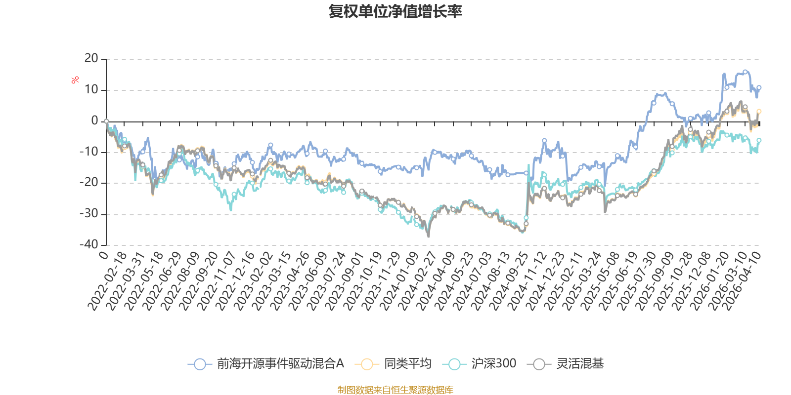 截至4月10日,前海开源事件驱动混合A近三个月复权单位净值增长率为0.56%,位于同类可比基金584/1287;近半年复权单位净值增长率为9.56%,位于同类可比基金368/1286;近一年复权单位净值增长率为31.93%,位于同类可比基金603/1286;近三年复权单位净值增长率为22.87%,位于同类可比基金472/1286。