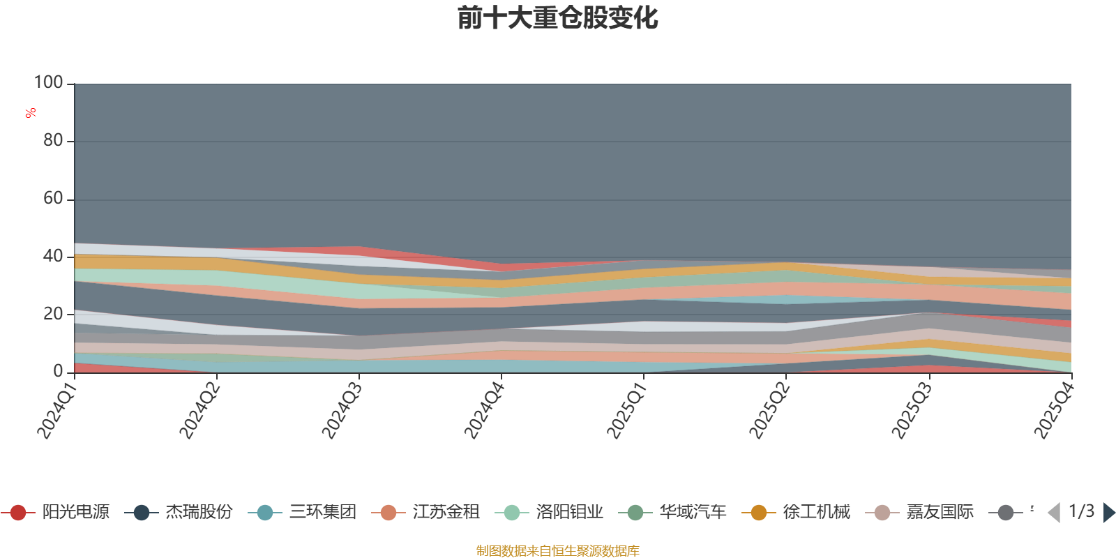 截至2025年末,基金十大重仓股分别是渝农商行、宁德时代、景津装备、嘉友国际、洛阳钼业、徐工机械、华鲁恒升、贵州茅台、联赢激光、美的集团。