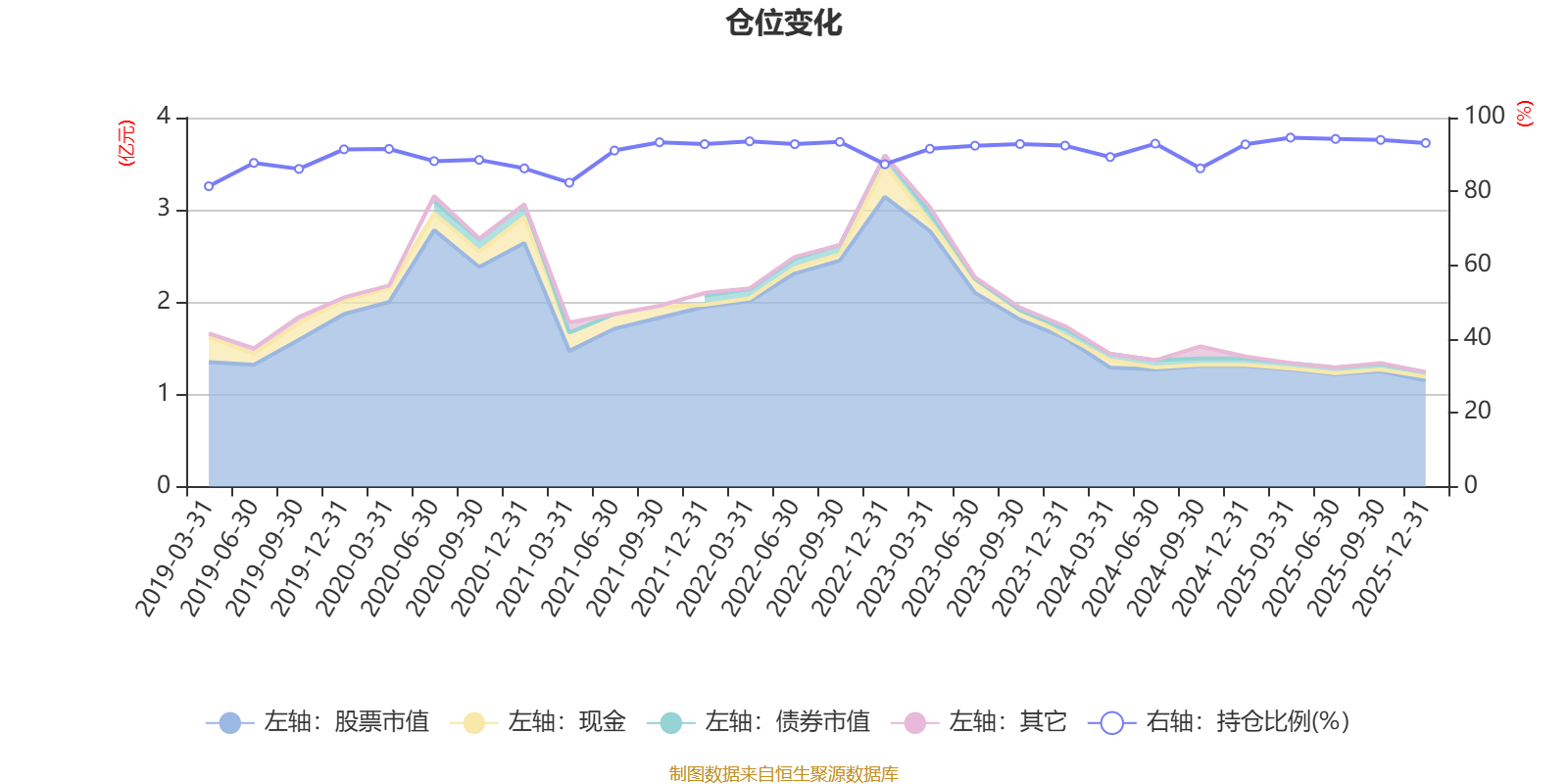 据定期报告数据统计,近三年平均股票仓位为92.19%,同类平均为88.27%。2025年一季度末基金达到94.57%的最高仓位,2019年一季度末最低,为81.4%。