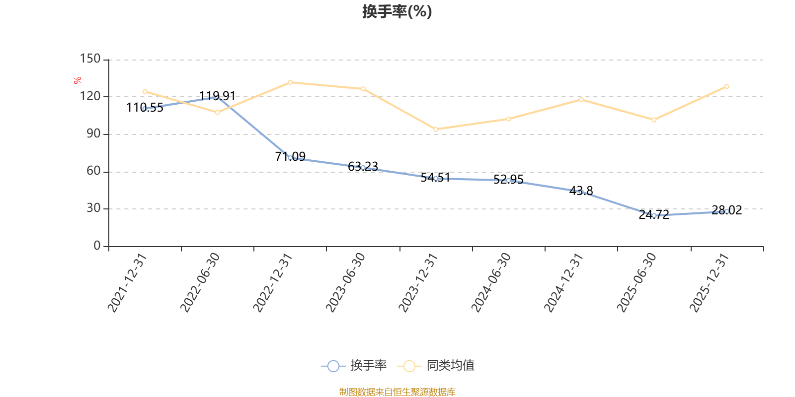 截至2025年12月31日,基金最近一年换手率约53.03%,持续3年低于同类均值。