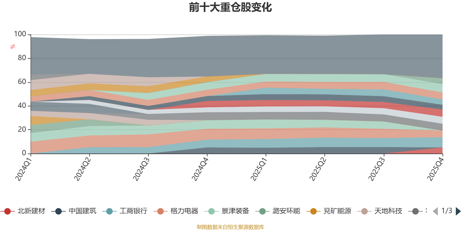该基金持股集中度较高,近2年前十大重仓股集中度长期超过60%。截至2025年末,基金十大重仓股分别是工商银行、招商银行、中国海洋石油、渝农商行、中煤能源、格力电器、农业银行、北新建材、海尔智家、腾讯控股、重庆农村商业银行。