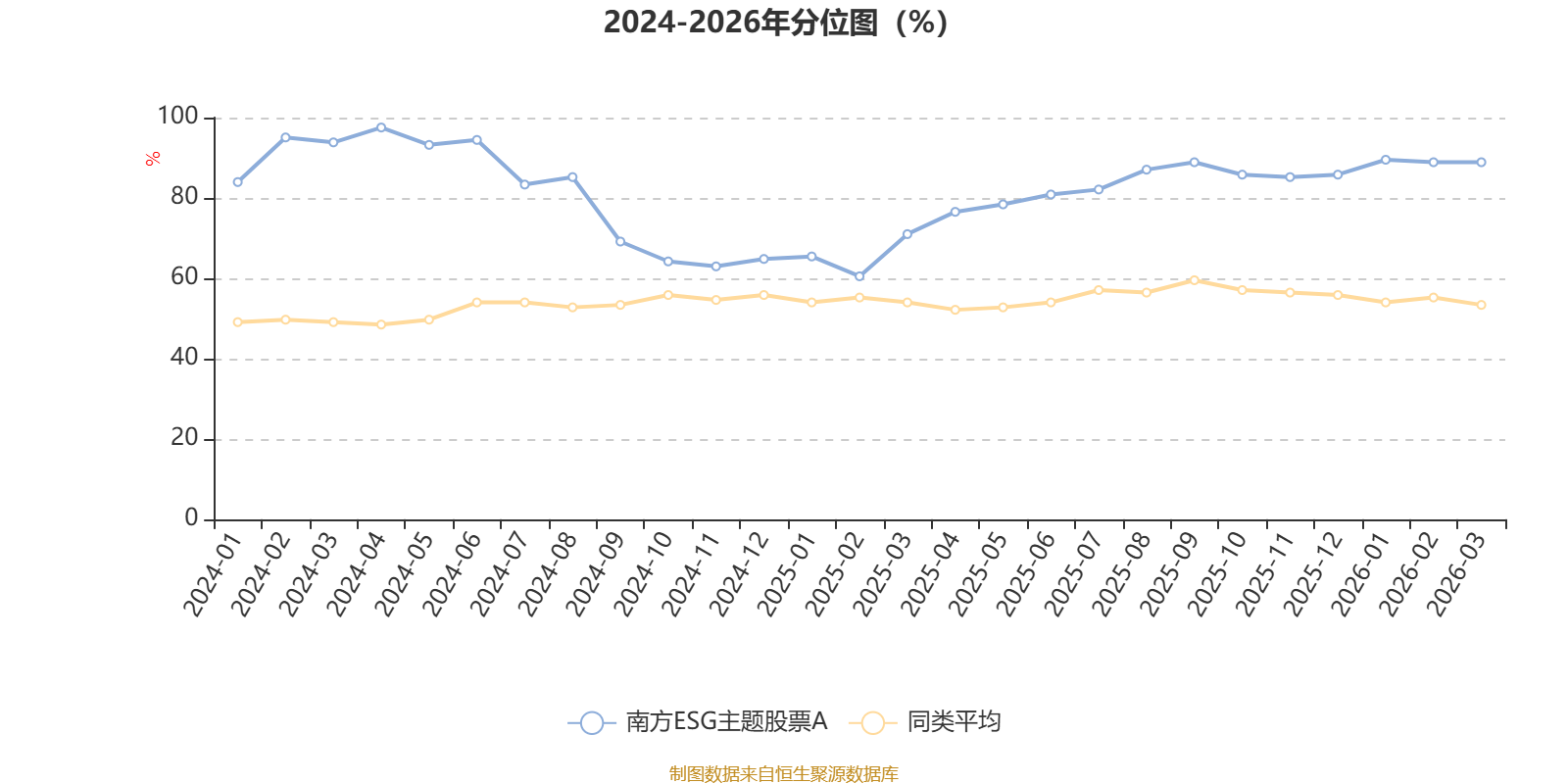 通过所选区间该基金净值增长率分位图,可以观察该基金与同类基金业绩比较情况。图为坐标原点到区间内某时点的净值增长率在同类基金中的分位数。