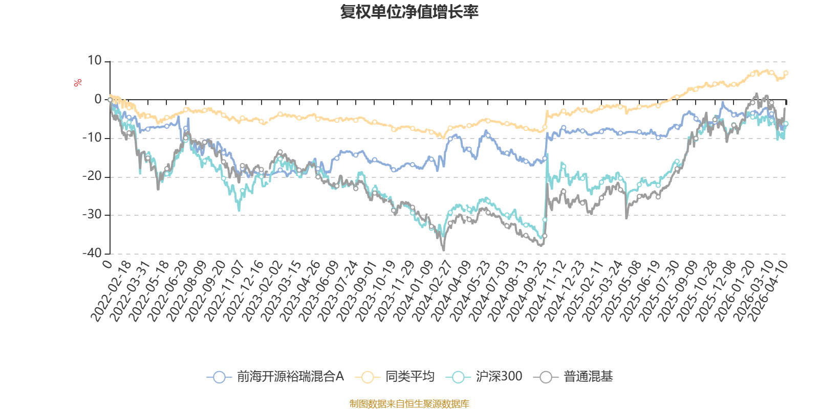 截至4月10日,前海开源裕瑞混合A近三个月复权单位净值增长率为-2.18%,位于同类可比基金594/629;近半年复权单位净值增长率为0.68%,位于同类可比基金438/629;近一年复权单位净值增长率为2.24%,位于同类可比基金577/629;近三年复权单位净值增长率为12.53%,位于同类可比基金240/581。