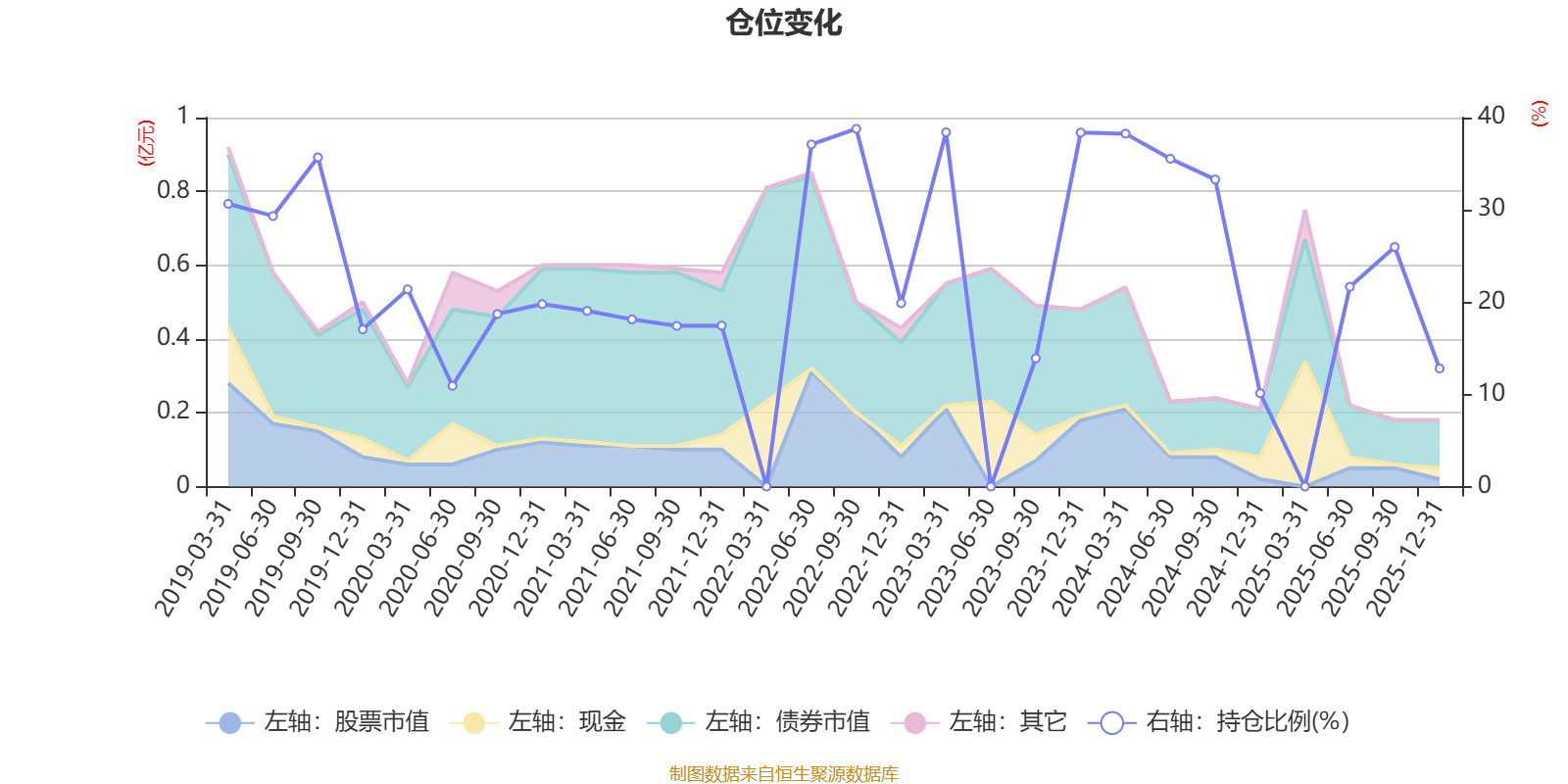 据定期报告数据统计,近三年平均股票仓位为22.36%,同类平均为19.2%。2022年三季度末基金达到38.78%的最高仓位,2024年末最低,为10.12%。