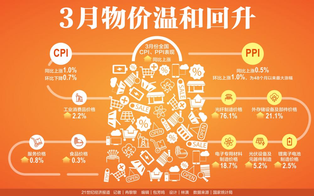 3月份,春节长假后消费需求季节性回落,居民消费价格指数(CPI)环比下降0.7%,同比上涨1.0%,扣除食品和能源价格的核心CPI同比上涨1.1%。