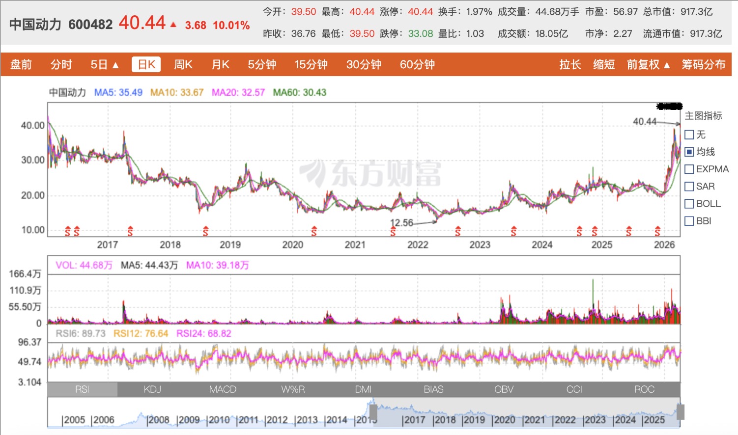 4月10日,中国动力(600482)开盘迅速涨停,截至收盘报40.44元/股,创下自2016年2月以来最高股价。消息面上,此前有传闻称“中国动力成功获得南美巴西油田项目80至100台25MW燃气轮机整机订单”。