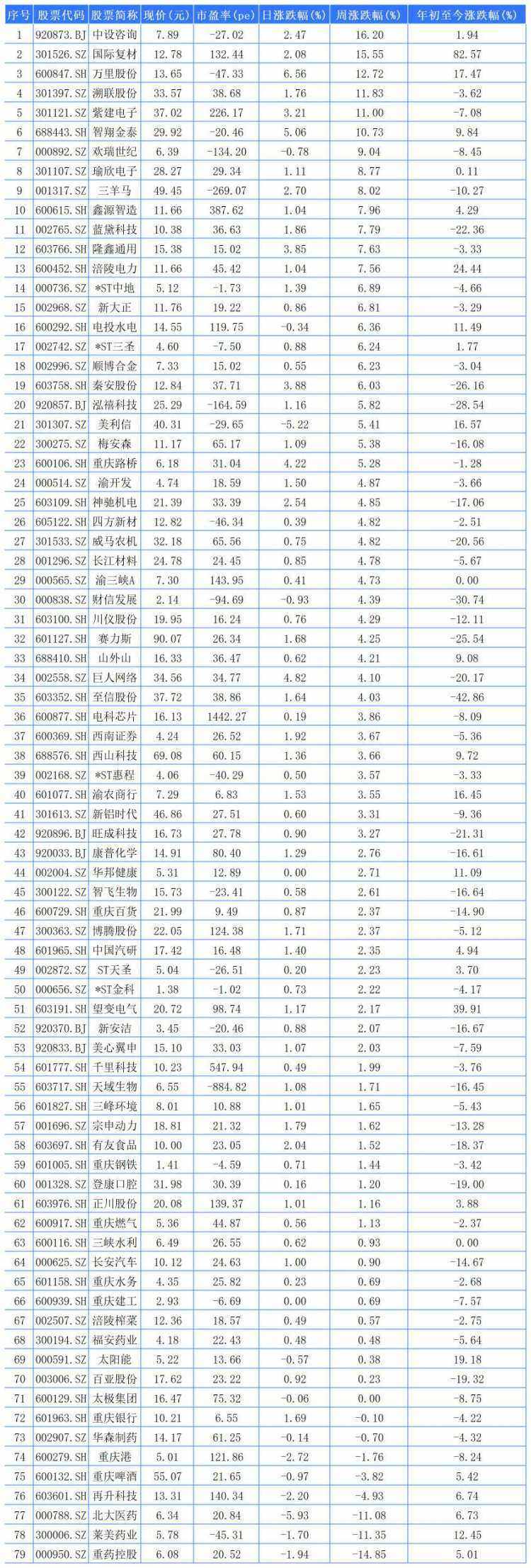 数据显示,79家重庆A股,其中收涨70家,收平1家,收跌8家。