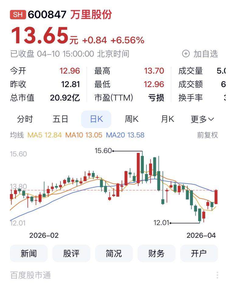 万里股份报收13.65元,日涨幅6.56%,换手率3.27%,周涨幅12.72%,今年以来涨幅17.47%。