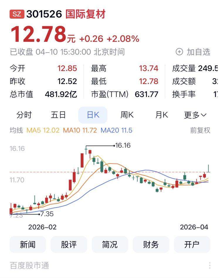 国际复材报收12.78元,日涨幅2.08%,换手率17.77%,周涨幅15.55%,今年以来涨幅82.57%。