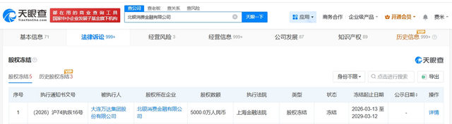 值得一提的是,4月7日,天眼查显示,北银消费金融新增一则股权冻结信息,被执行人是大连万达集团股份有限公司,冻结股权数额达5000万元,冻结期限为3年,执行法院为上海金融法院。