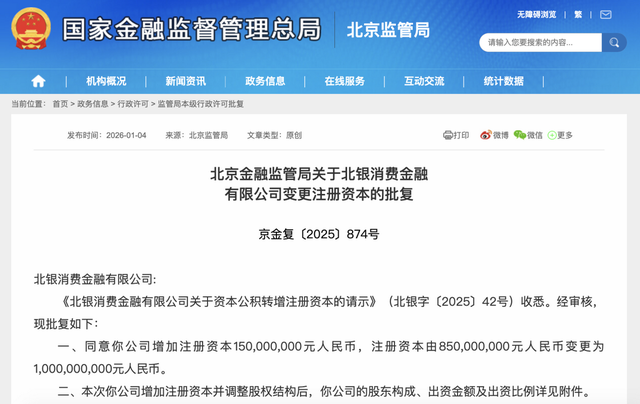 就在今年初,北银消费金融刚刚迎来新一轮增资。2026年1月4日,北京金融监管局下发的批复公告显示,北银消费金融获批增加注册资本1.5亿元人民币,注册资本由8.5亿元人民币变更为10亿元人民币。