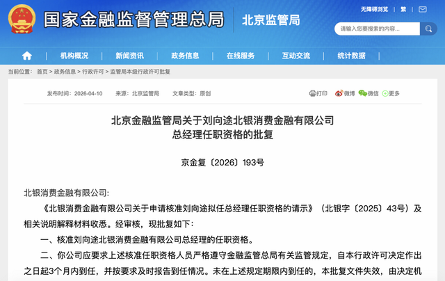 4月10日,北京金融监管局发布《关于刘向途北银消费金融有限公司总经理任职资格的批复》显示,经审核,核准刘向途北银消费金融有限公司总经理的任职资格。